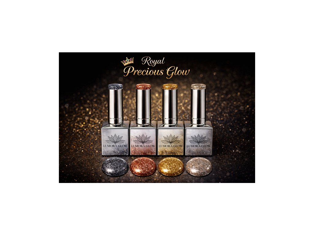 Kolekcia Royal Precious Glow je najvznešenejšou tvárou luxusného glitter sveta Lumora Glow. Štyri exkluzívne, drahými kovmi inšpirované odtiene, ktoré dodávajú každému nechtovému dizajnu šperkový lesk, jemnú žiaru a prémiový vzhľad.